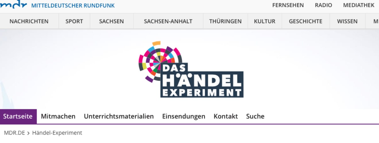 Und wenn man dann tatsächlich auf www.mdr.de/haendelexperiment landet, ist der erste Eindruck, dass es ein schweres und opulentes Stück Internet ist: große, aussagekräftige Bilder, unüberschaubar viele Möglichkeiten an Links, Wegen und Verweisen und Grußworte von zehn Kultus- bzw. Bildungsministern auf der Startseite. Darunter schließlich noch Logos von bedeutenden Unterstützern wie dem Deutschen Musikrat oder dem Bundesverband Musikunterricht.